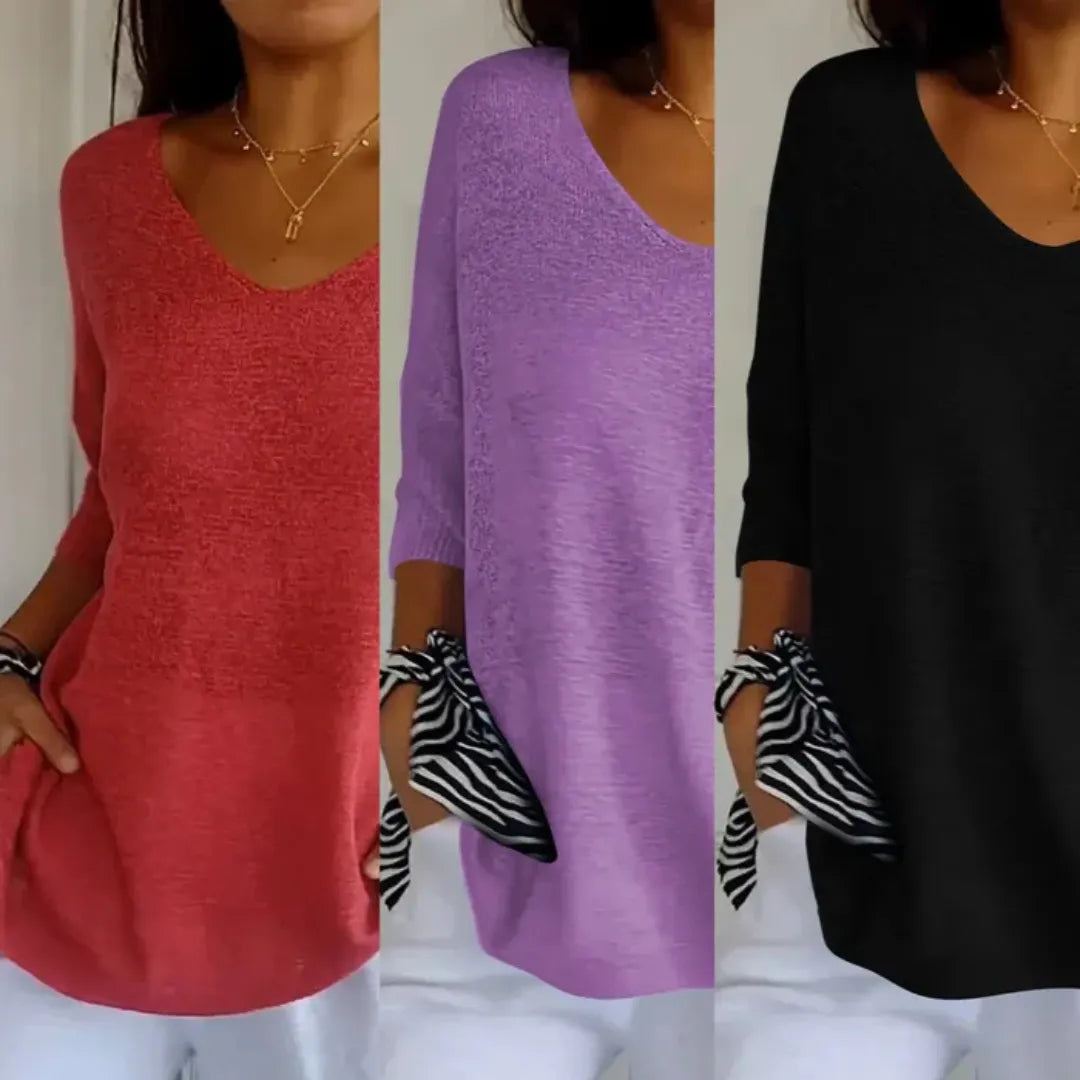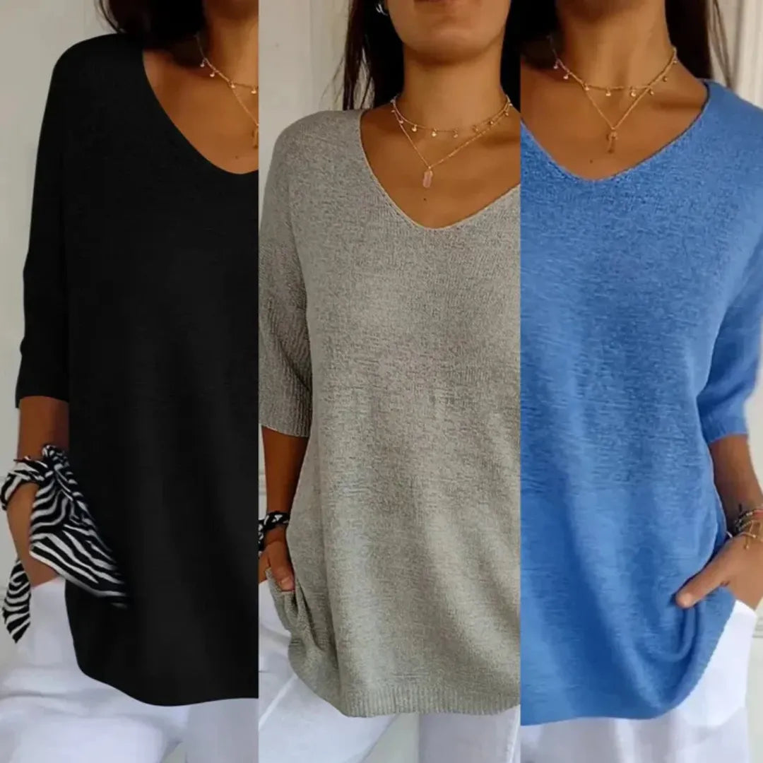 Mangas tres cuartos, textura ligera y acabados de calidad hacen de esta prenda un básico indispensable. Ideal para combinar con jeans, pantalones de lino o faldas elegantes. Disponible en varios colores: negro, gris, lila, rosa, beige y azul.